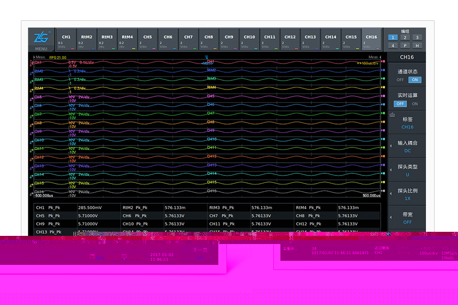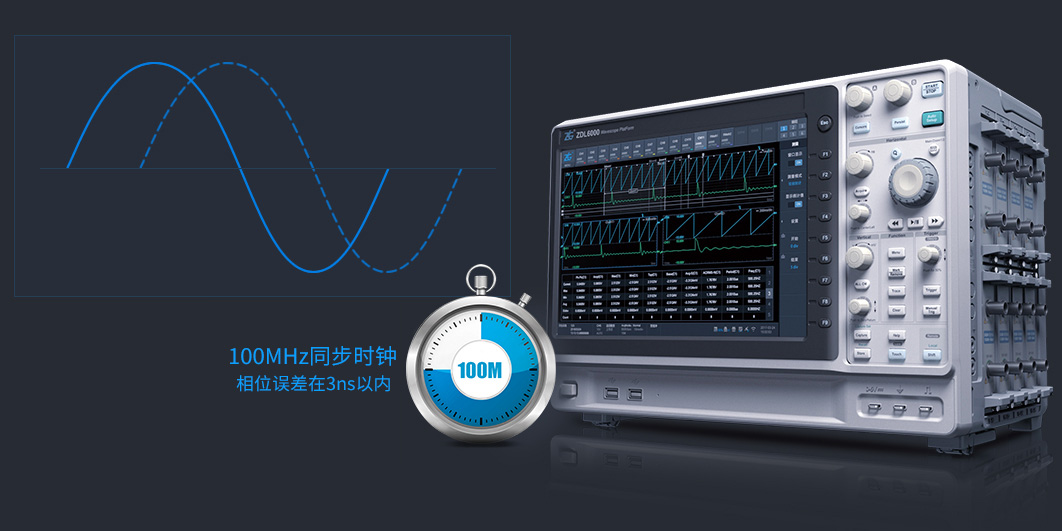 示波记录仪内部设有高稳定性温度补偿的100MHz同步时钟,避免了温度带来时钟漂移所引入的测量误差。同时也保证了每一个通道ADC的采样相位同步,减少了测量时通道间相位角所引入的误差,误差在3ns以内,保证所有通道信号同步测试。