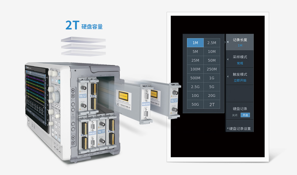 在记录模式下,示波记录仪可选配2T固态硬盘实时存储,实时记录采样率可达1MSa/s,用作测量平台时,耐久性测试的数据记录时间可长达500天。